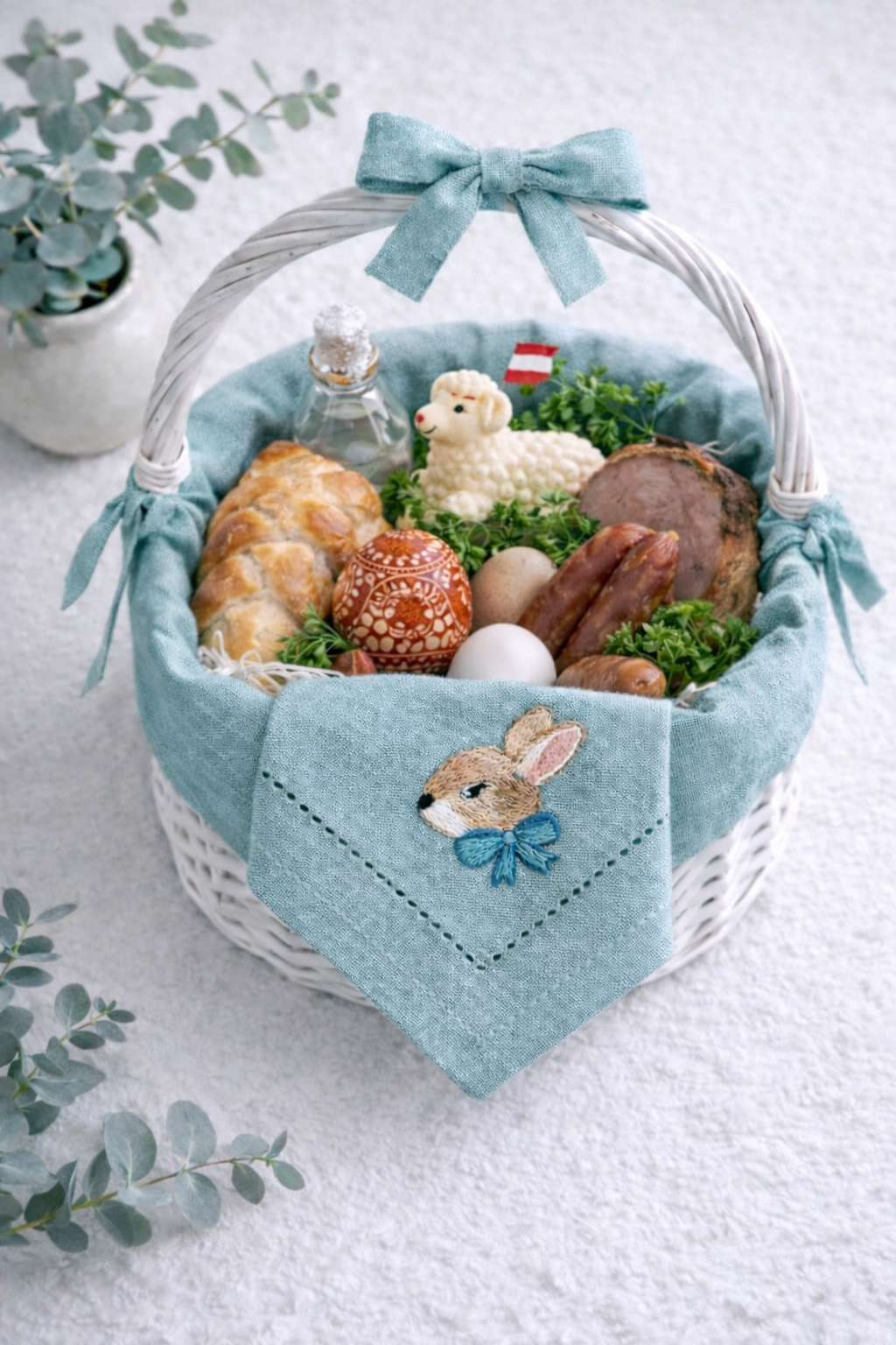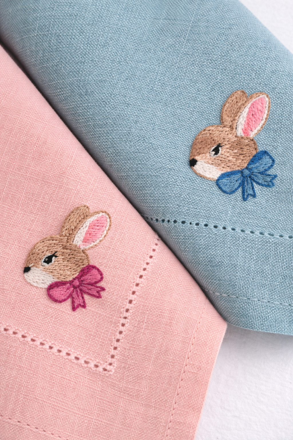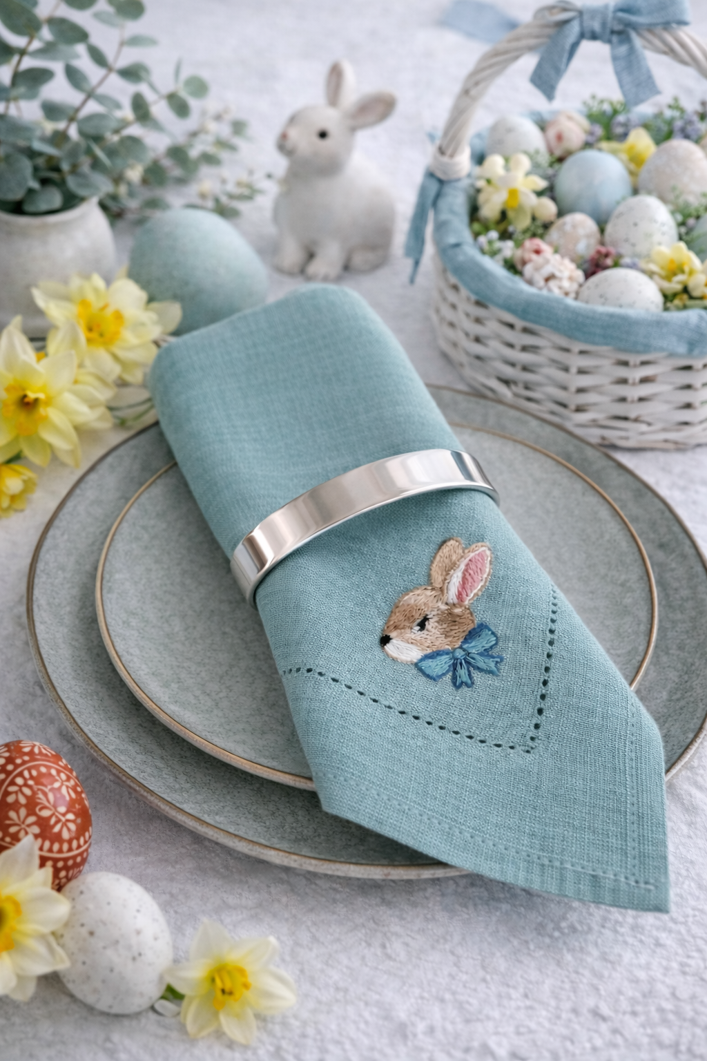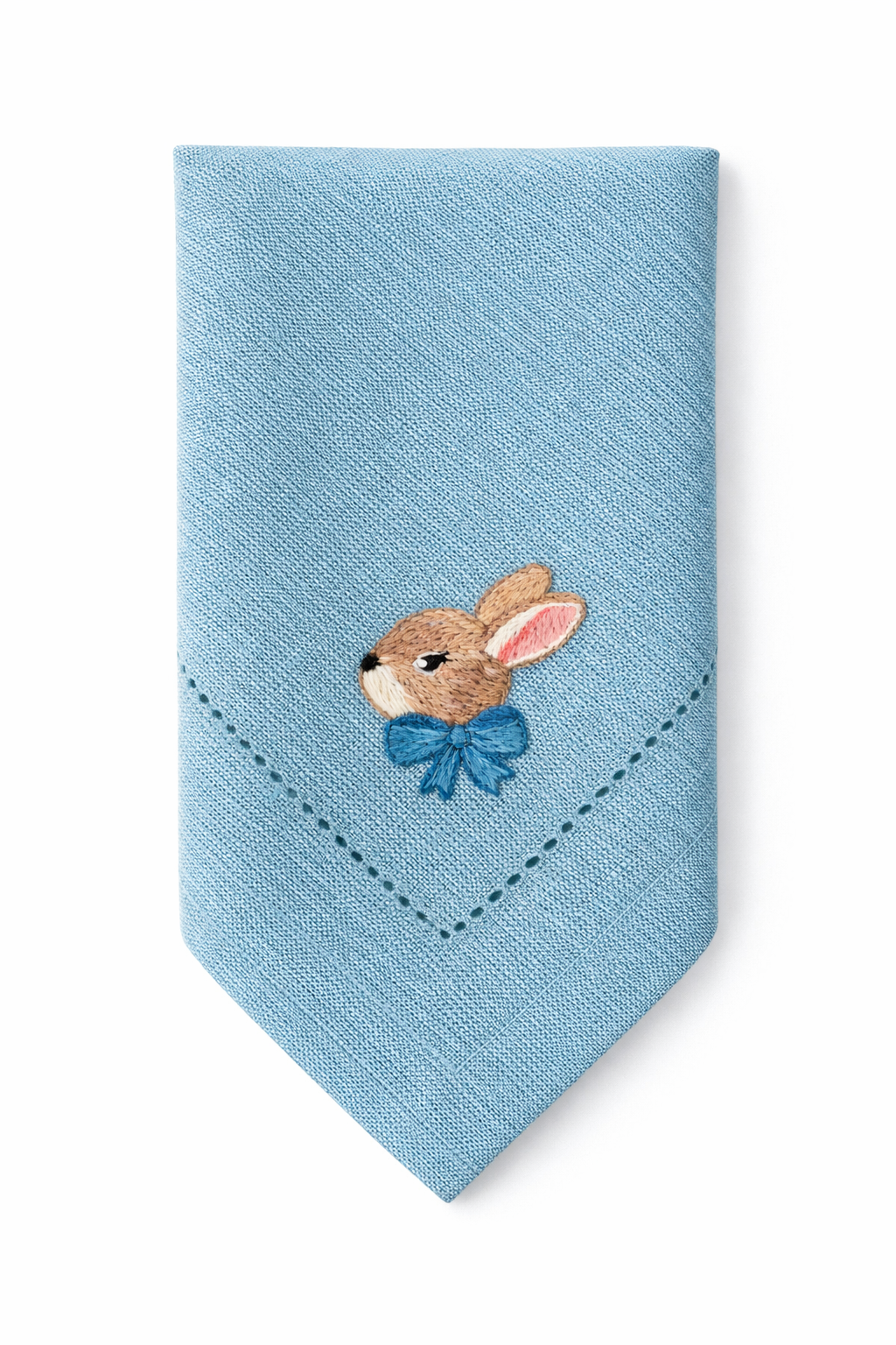 Pastelowy błękit to klasyczny, wiosenny akcent, który wnosi do wnętrza świeżość i lekkość. Ręcznie wykonany haft króliczka dodaje serwetce wyjątkowego, uroczego charakteru.