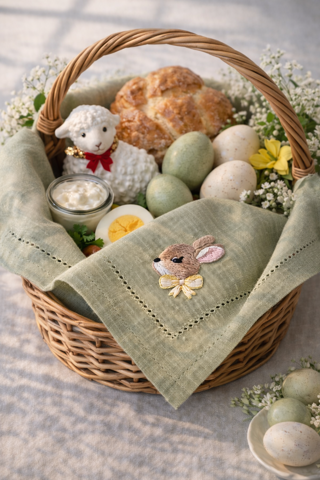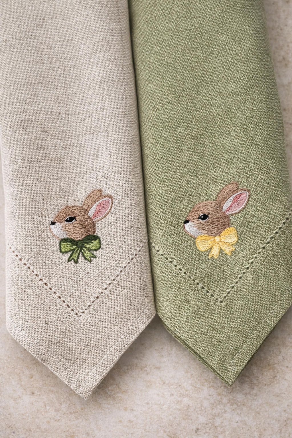 Delikatna serwetka z ręcznie wykonanym haftem króliczka to wiosenny akcent, który nada Twojemu wnętrzu świeżości i naturalnego uroku.