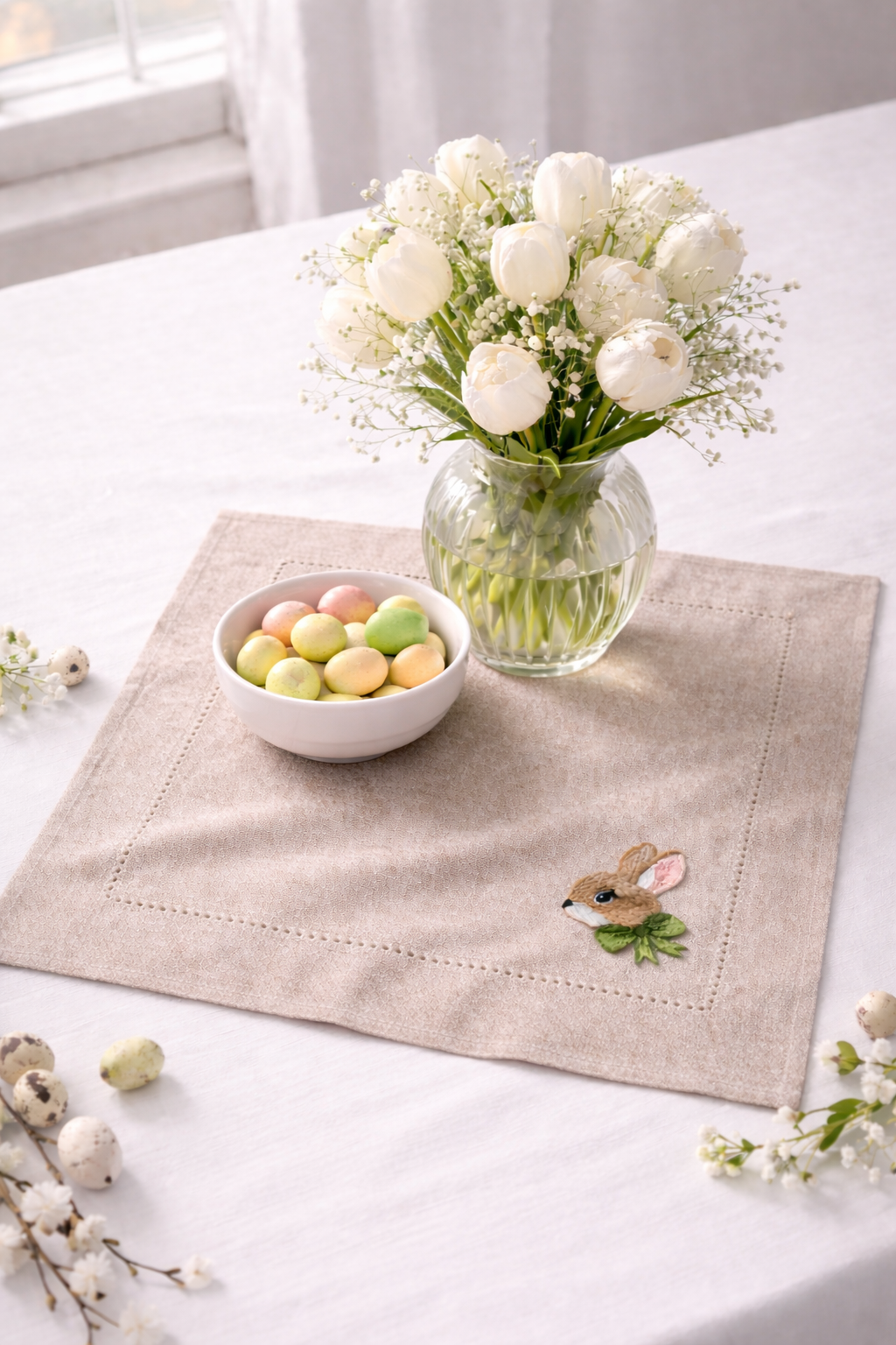 Lniana serwetka w naturalnym, jasnym odcieniu ecru to ponadczasowa baza wielkanocnej aranżacji.