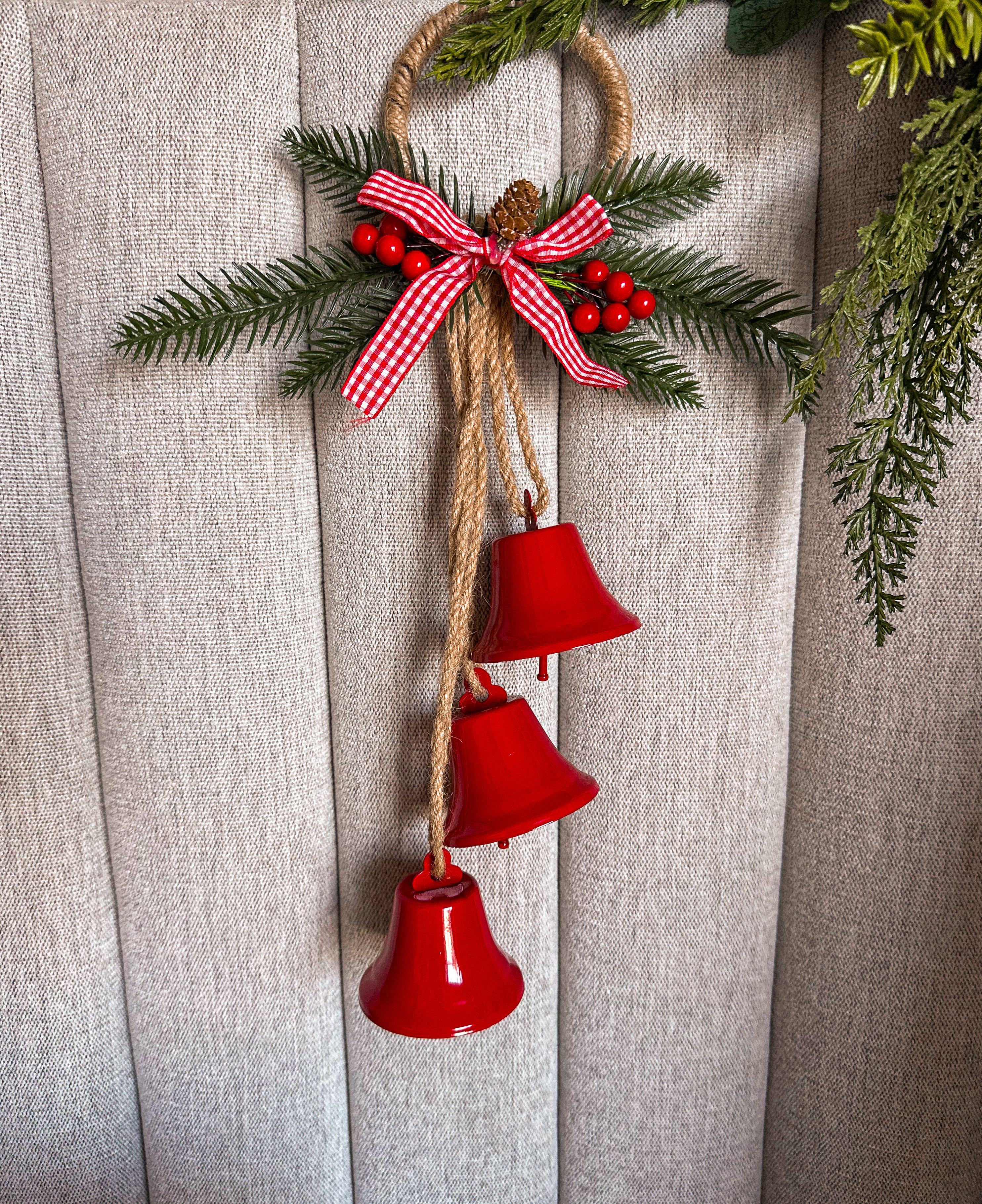 BELLISO to elegancka dekoracja świąteczna w formie trzech czerwonych metalowych dzwonków zawieszonych na jutowych sznurkach.