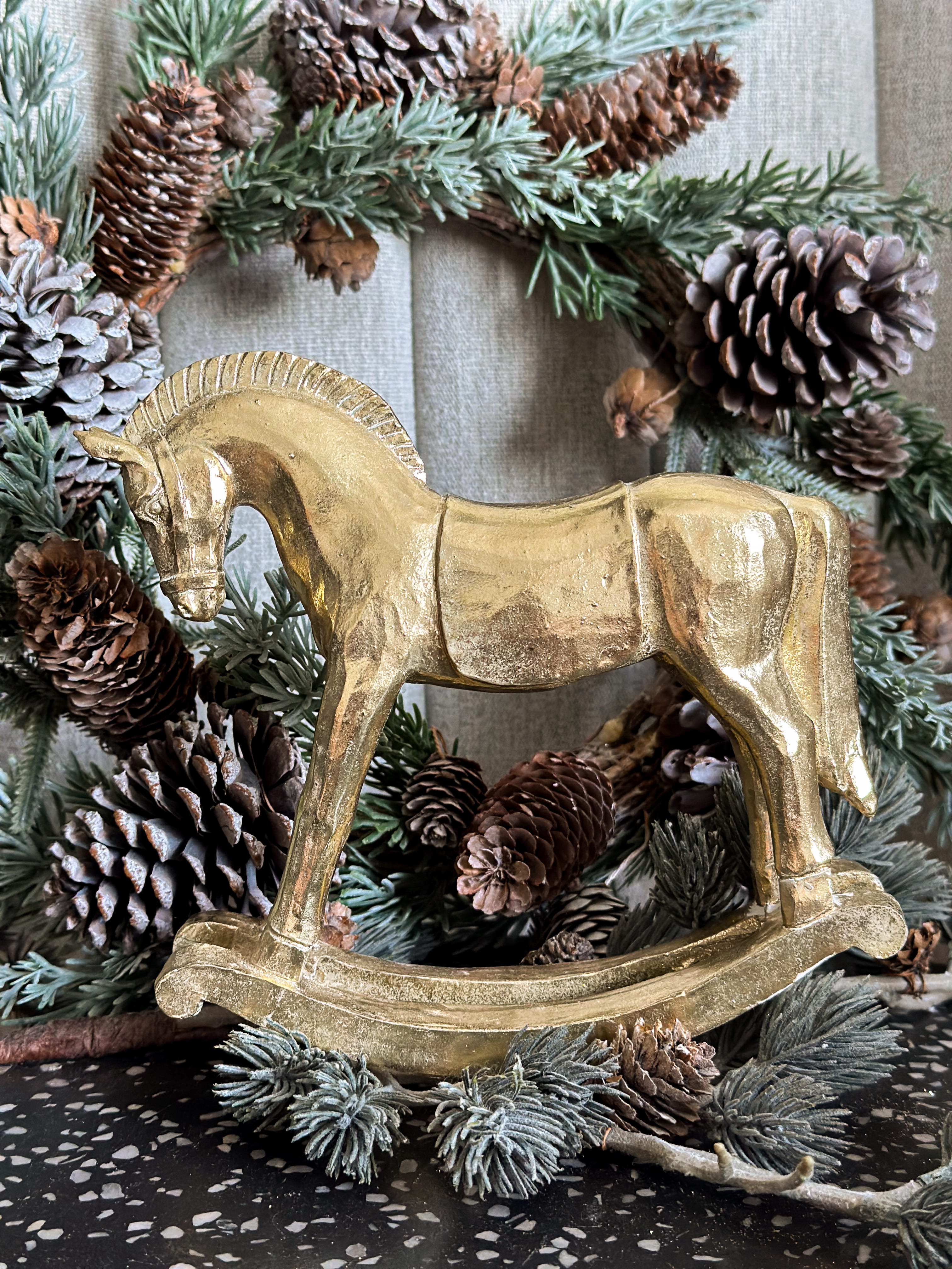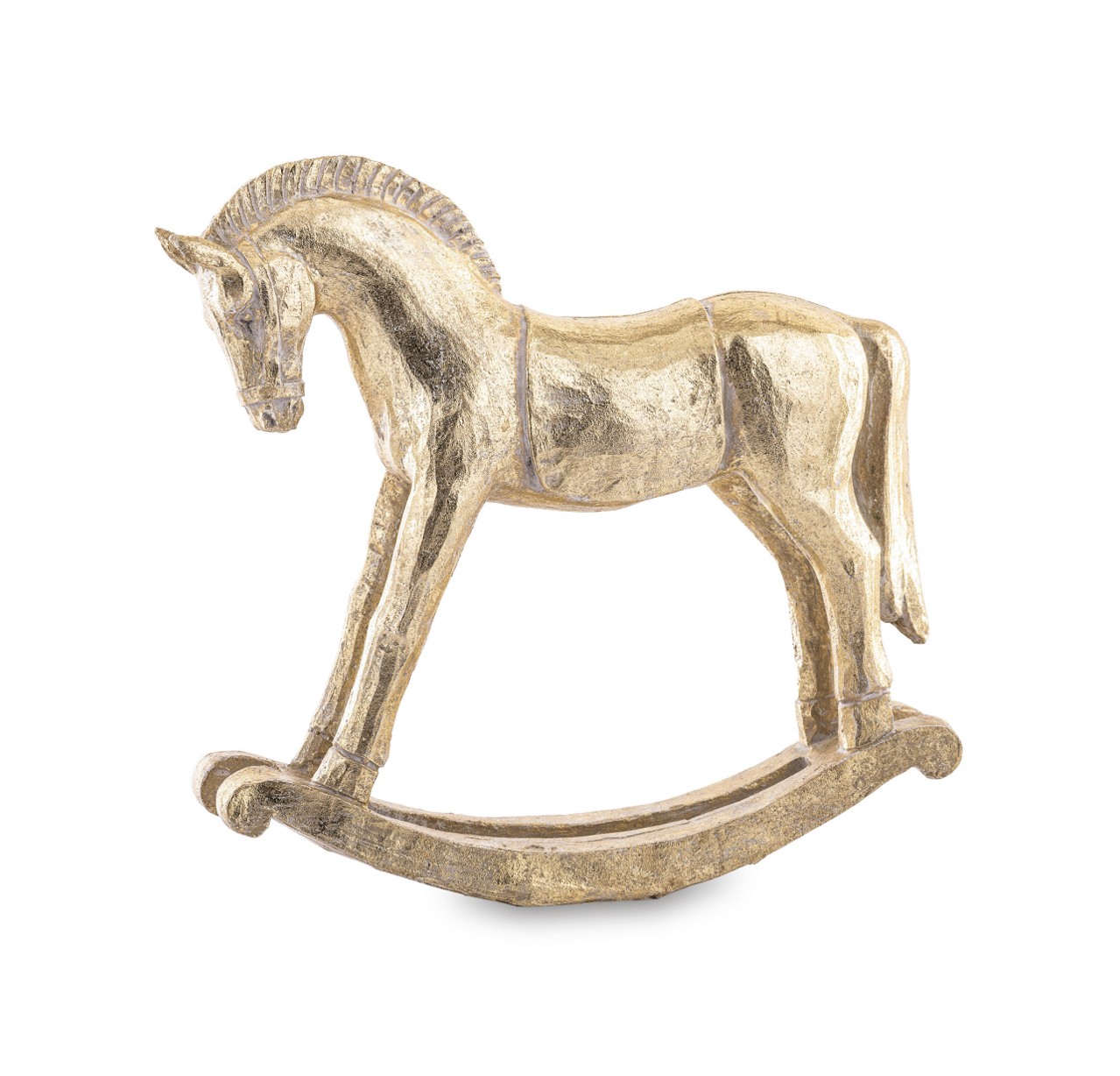 GILDAR to elegancka figurka dekoracyjna w kształcie konika na biegunach, pokryta złotym wykończeniem o postarzonej fakturze.