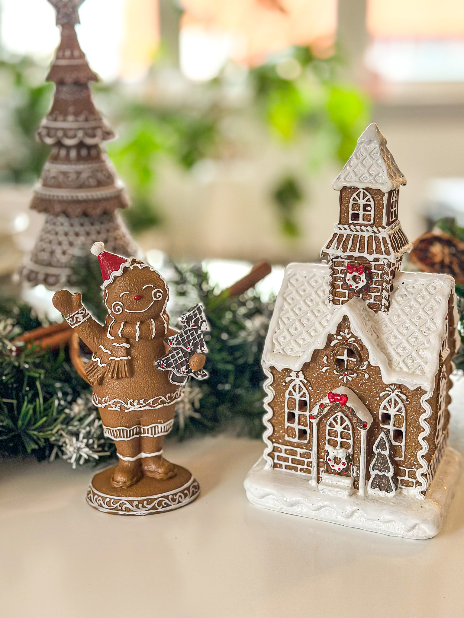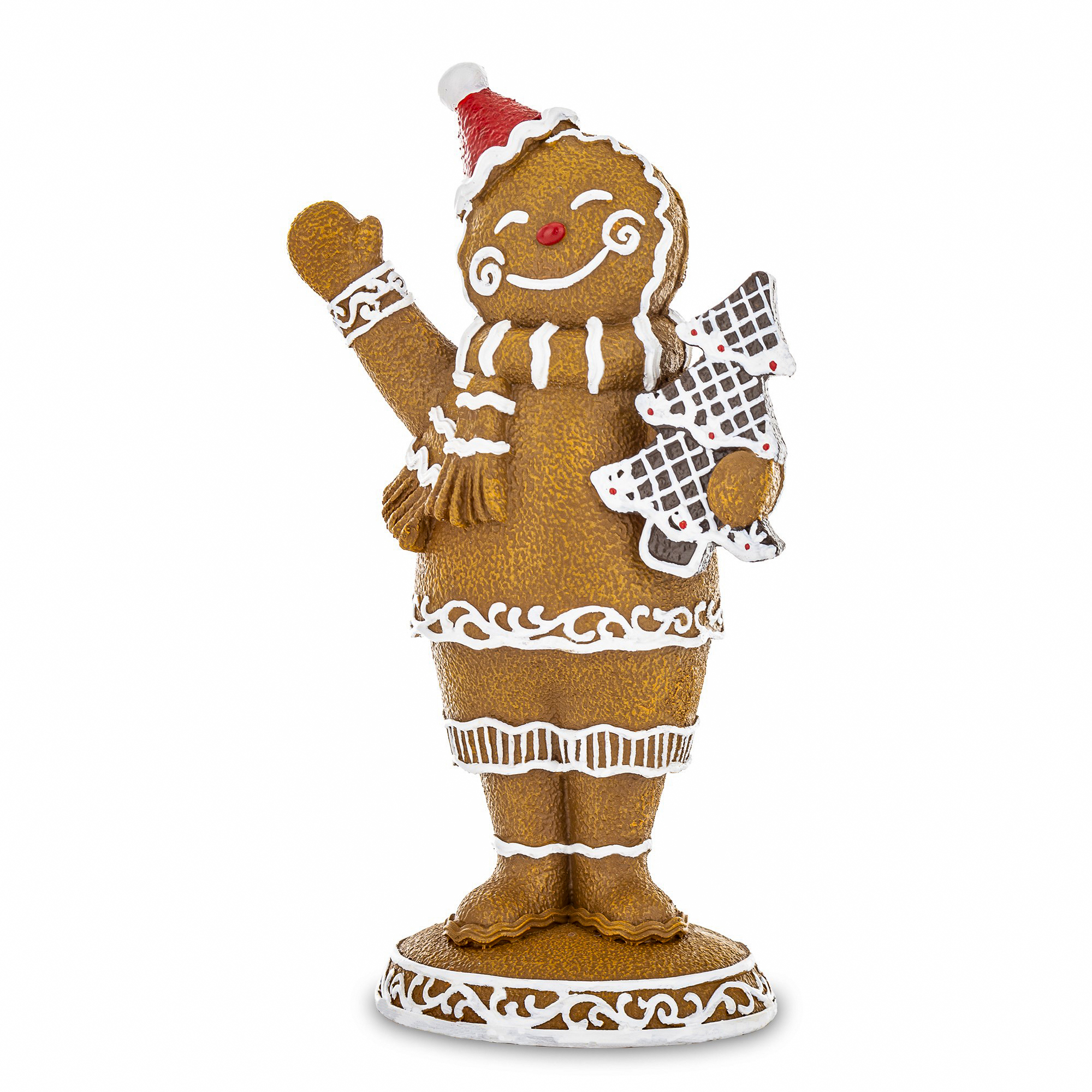 GINGERBOY to słodka, bożonarodzeniowa figurka przedstawiająca radosnego piernikowego chłopca w czapce Mikołaja i z choinką w ręku.