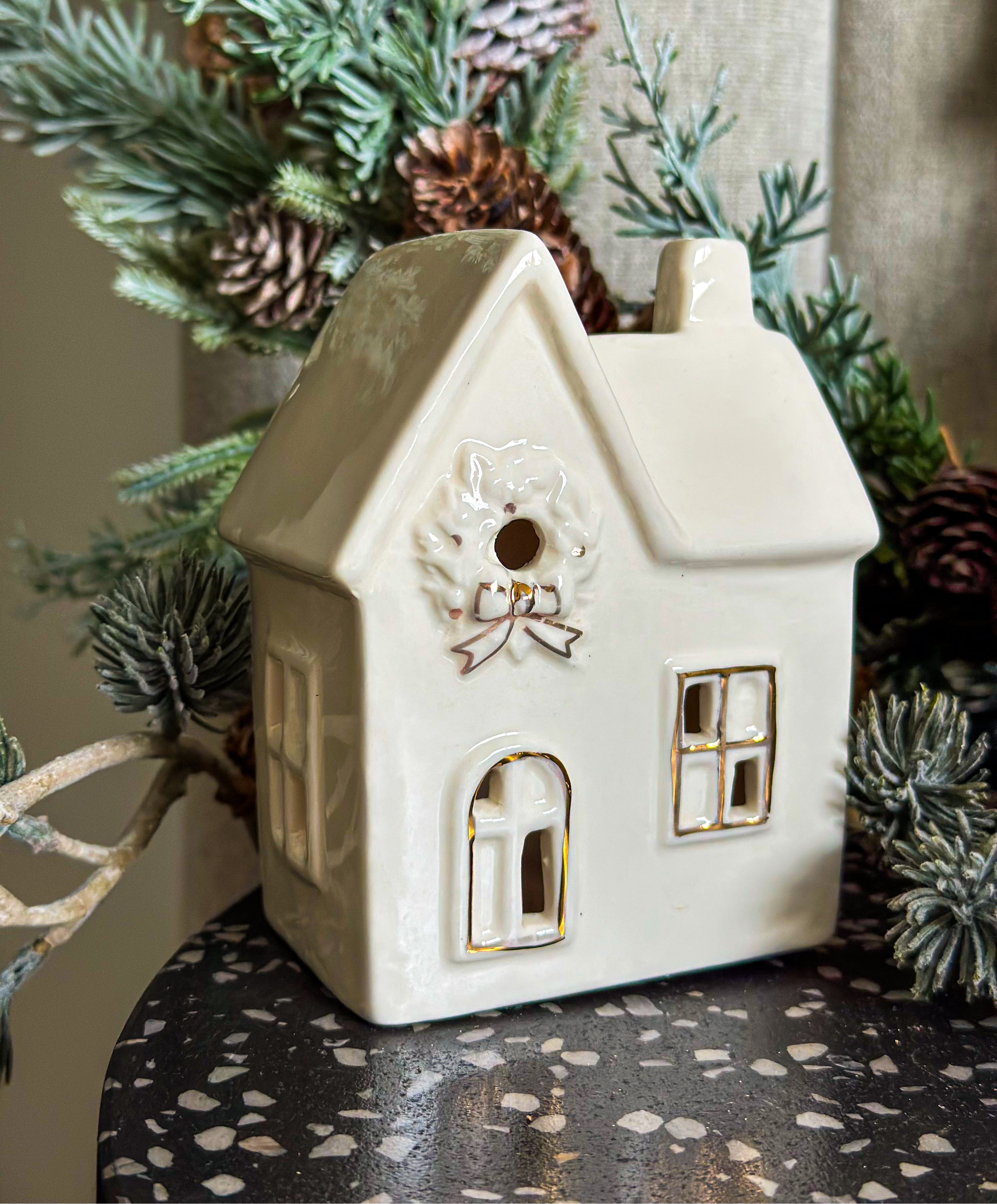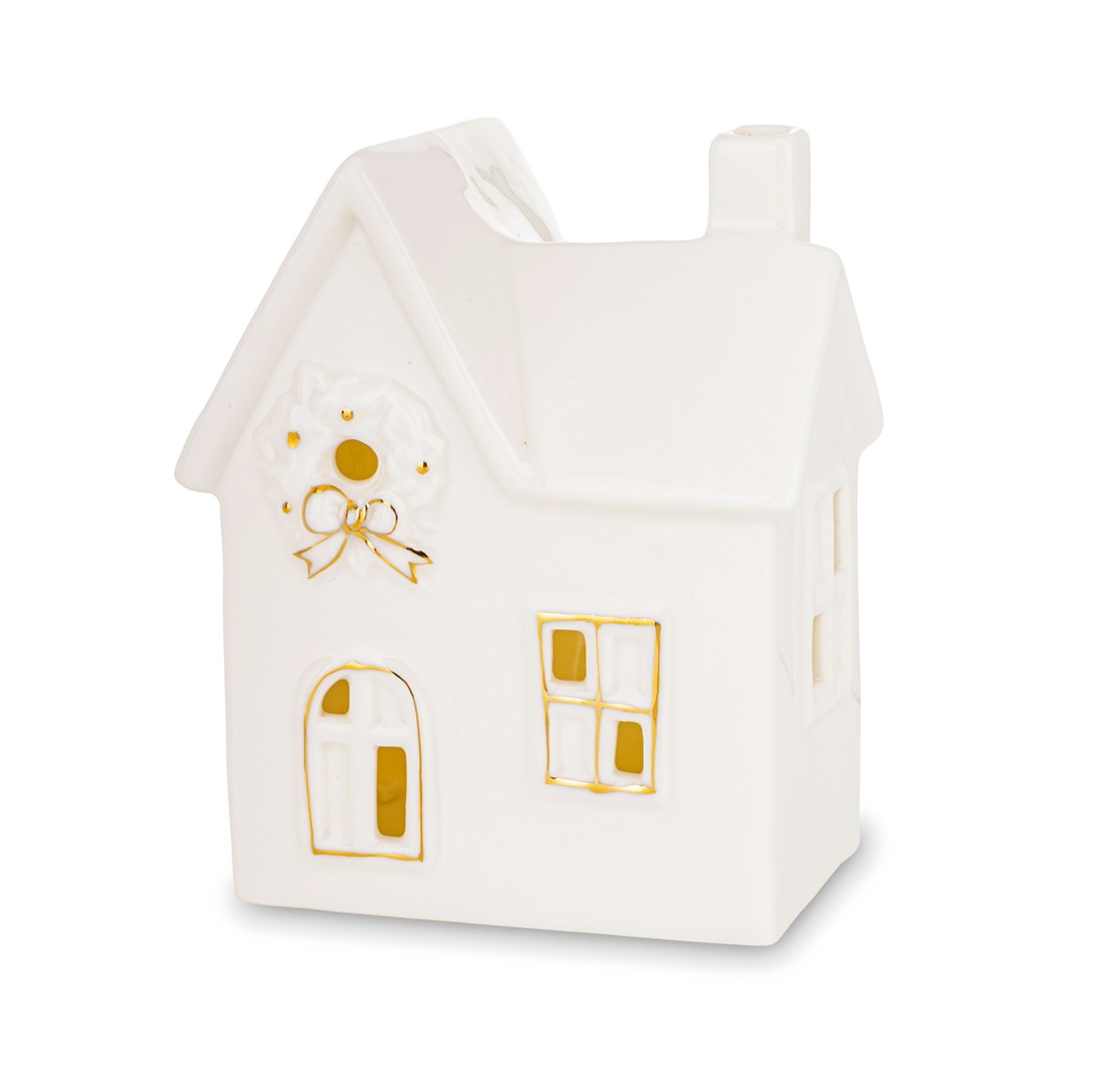 Urokliwa dekoracja NEVIRA w formie ceramicznego domku z eleganckimi złotymi akcentami. Idealna do stworzenia świątecznego klimatu – subtelne światło LED wniesie do wnętrza ciepło i przytulność.