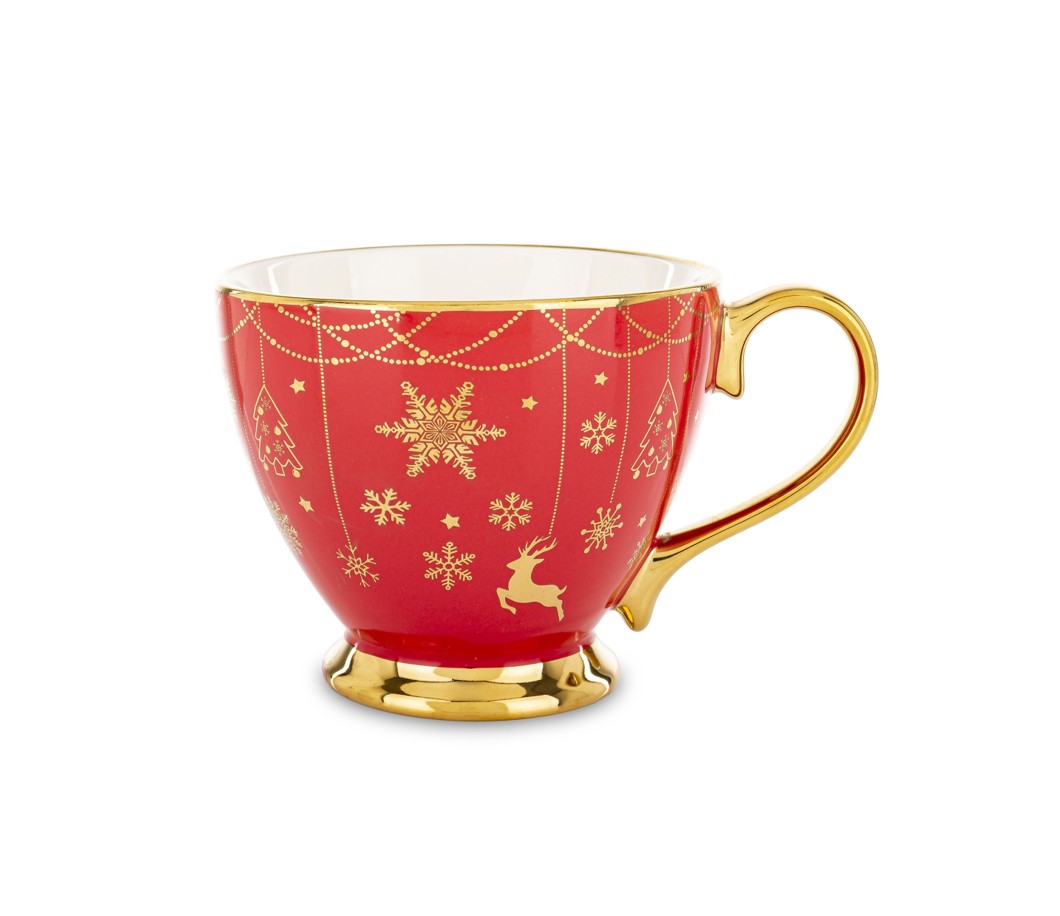Kubek STELIA to elegancka porcelanowa propozycja na zimowe dni. Utrzymany w intensywnej czerwieni, ozdobiony złotymi płatkami śniegu, choinkami i reniferem – wprowadza świąteczną atmosferę od pierwszego łyka ulubionego napoju.