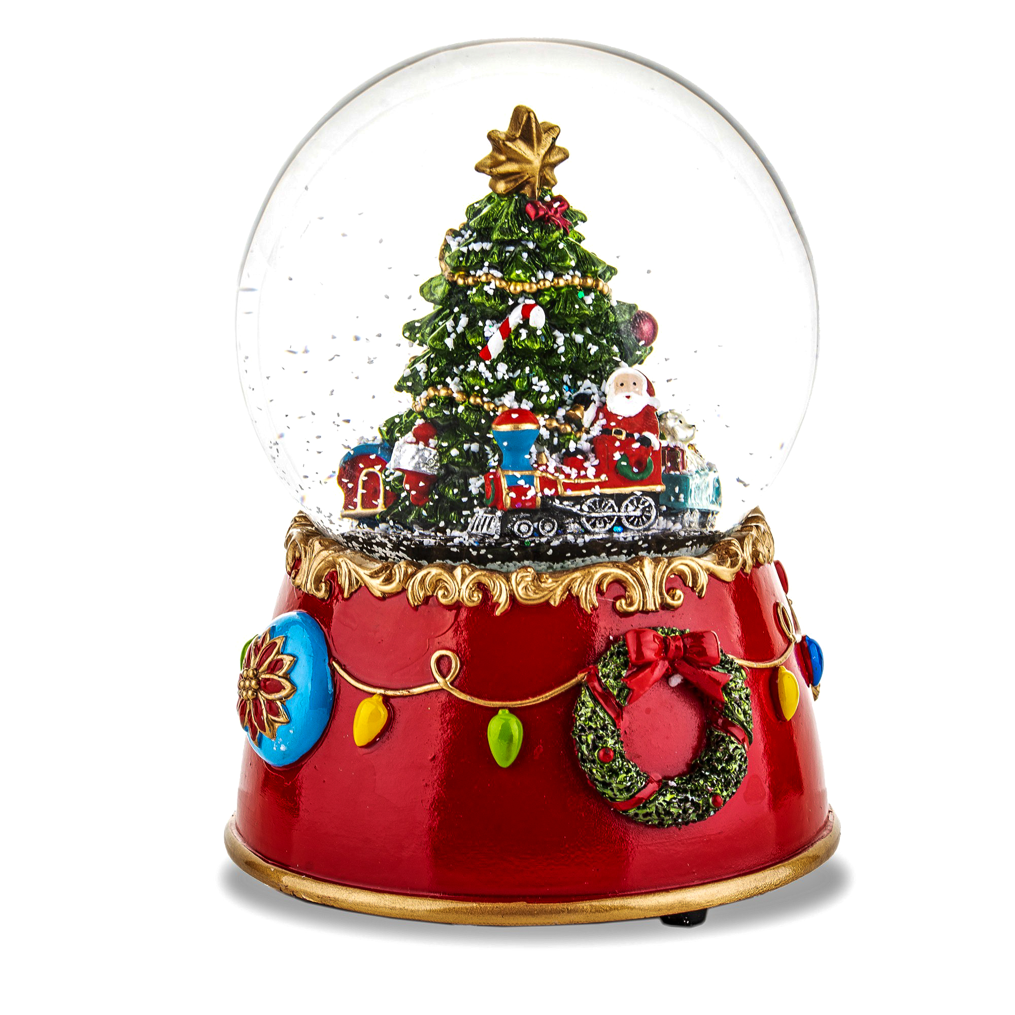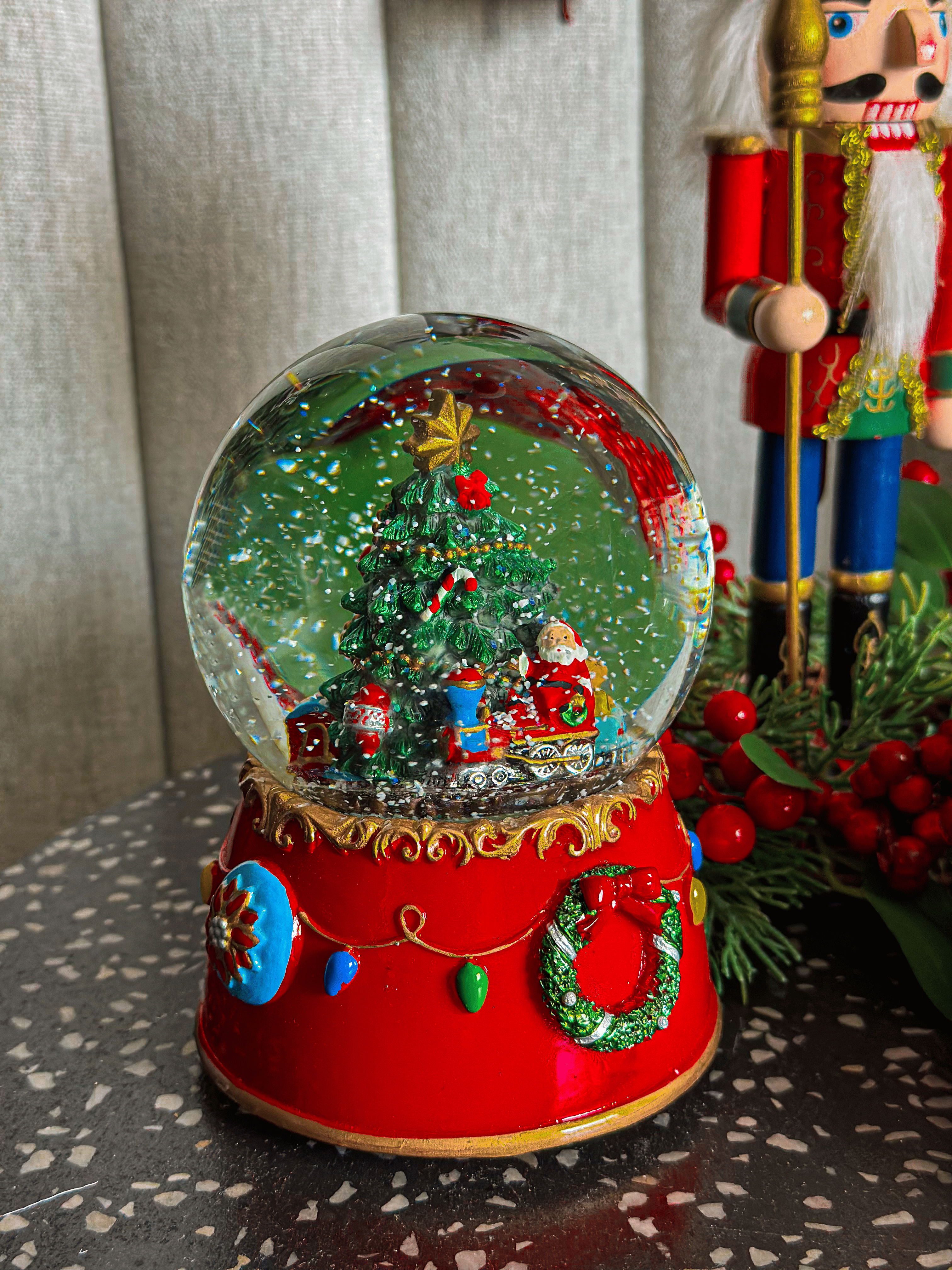 Po nakręceniu pozytywki usłyszysz świąteczny przebój „We Wish You a Merry Christmas”, a po potrząśnięciu drobinki śniegu zaczną wirując opadać na choinkę z pociągiem i Świętym Mikołajem.