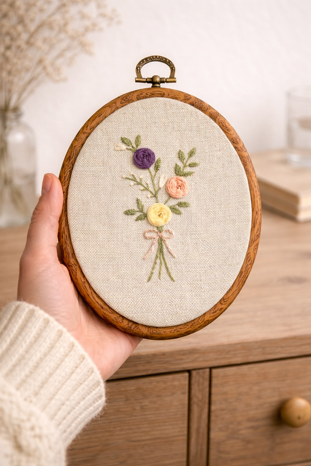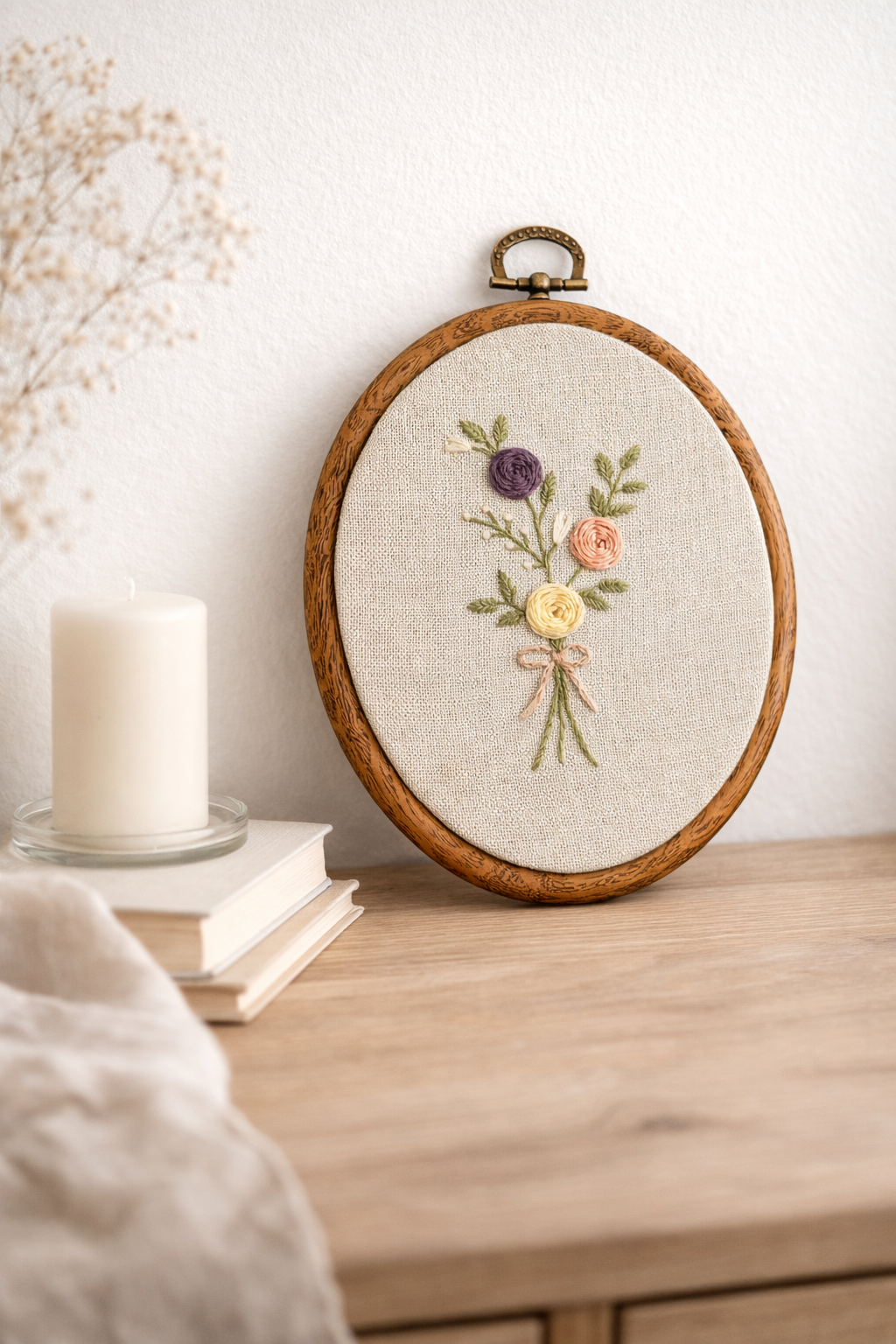 Haftowany obrazek z motywem subtelnego bukietu kwiatów to elegancka dekoracja, która wnosi do wnętrza ciepło i delikatny, romantyczny akcent. Wykonany na naturalnej, lnianej tkaninie, przyciąga uwagę swoją strukturą i spokojną kolorystyką.