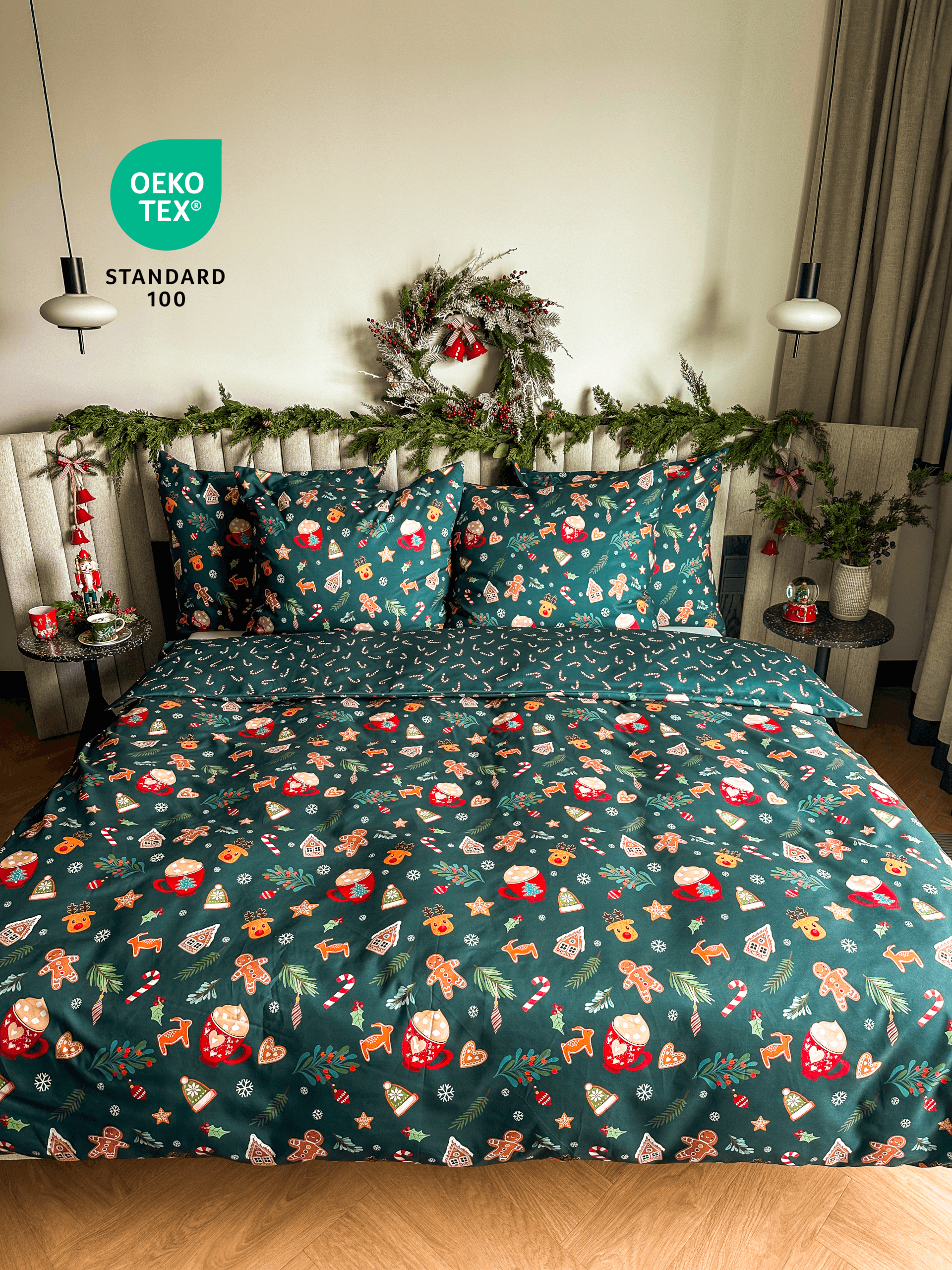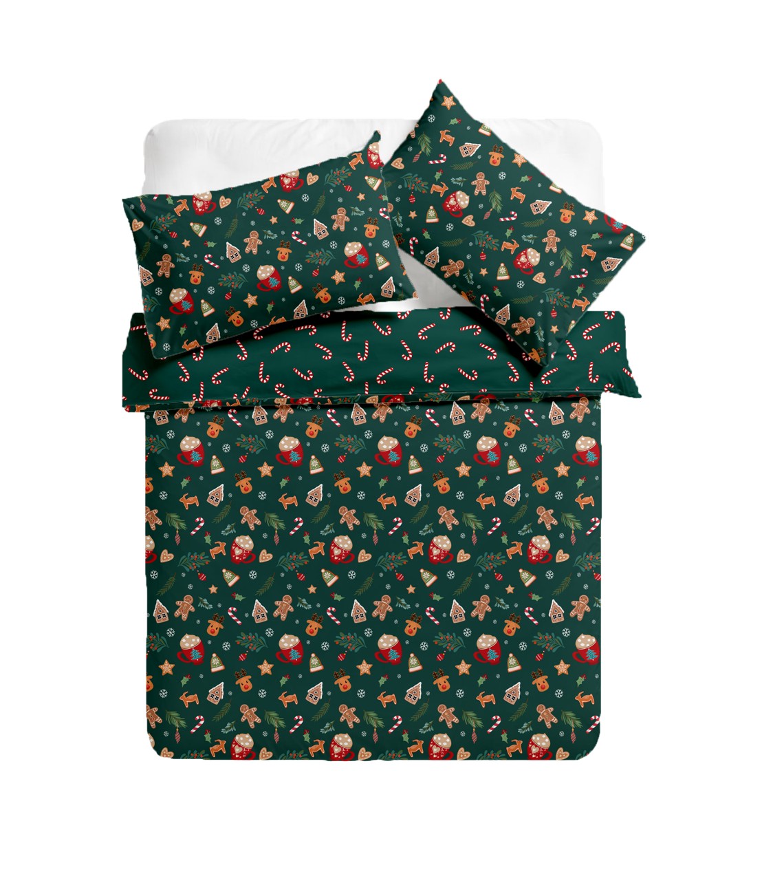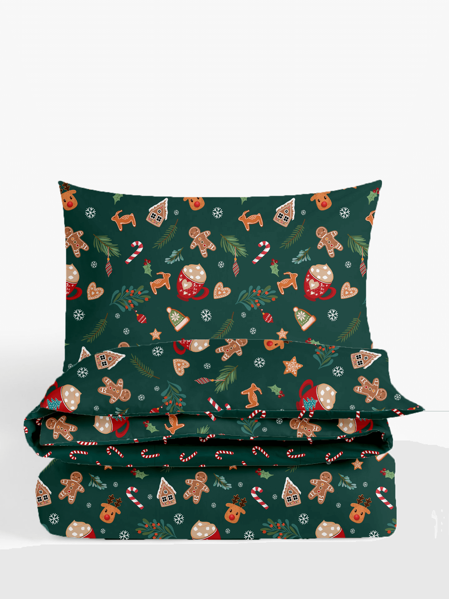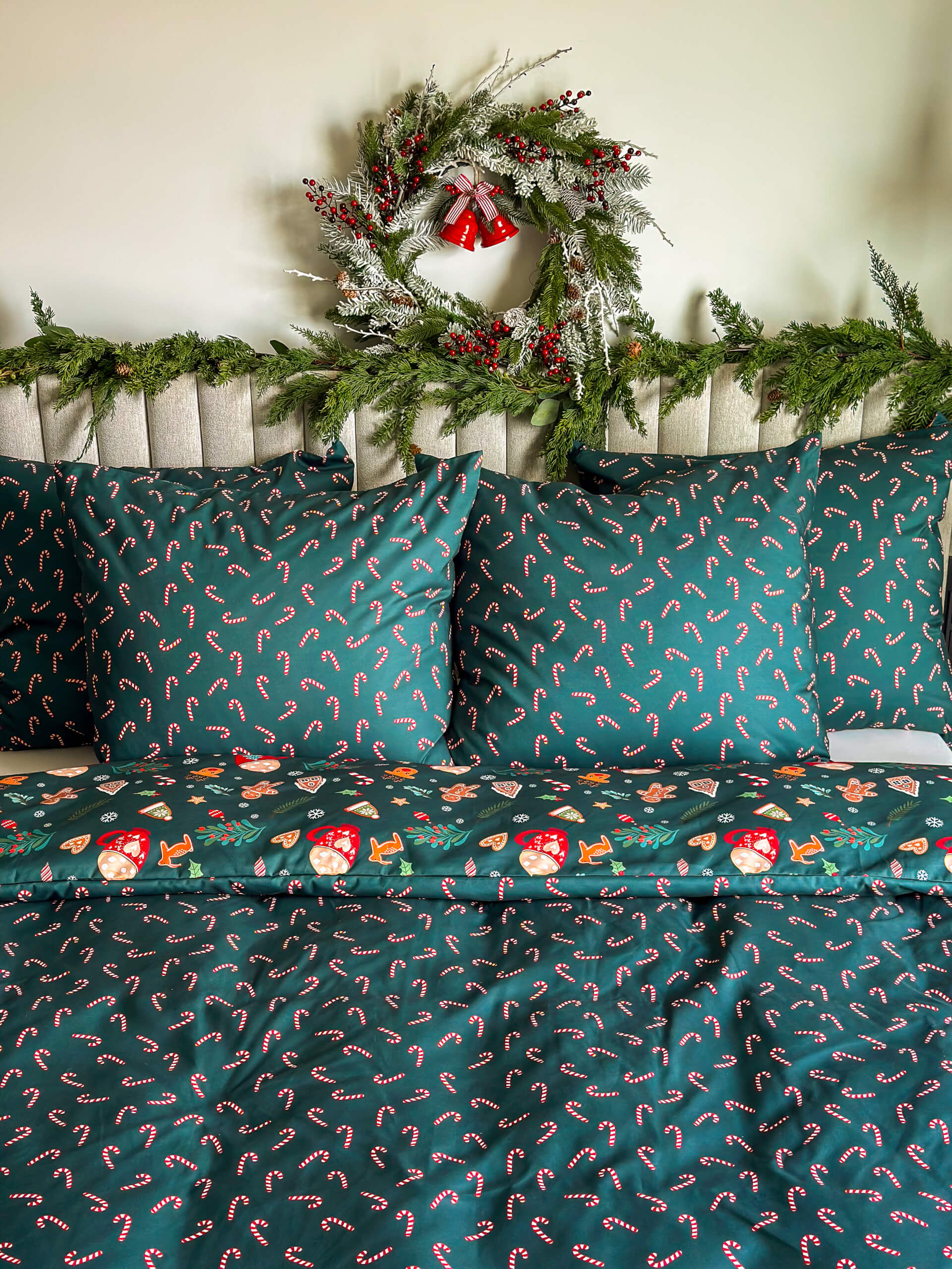 Ciemna zieleń, pierniczki, serduszka, cukrowe laski i ozdoby choinkowe tworzą magiczny wzór, który wprowadza ciepło i radość do każdej sypialni.