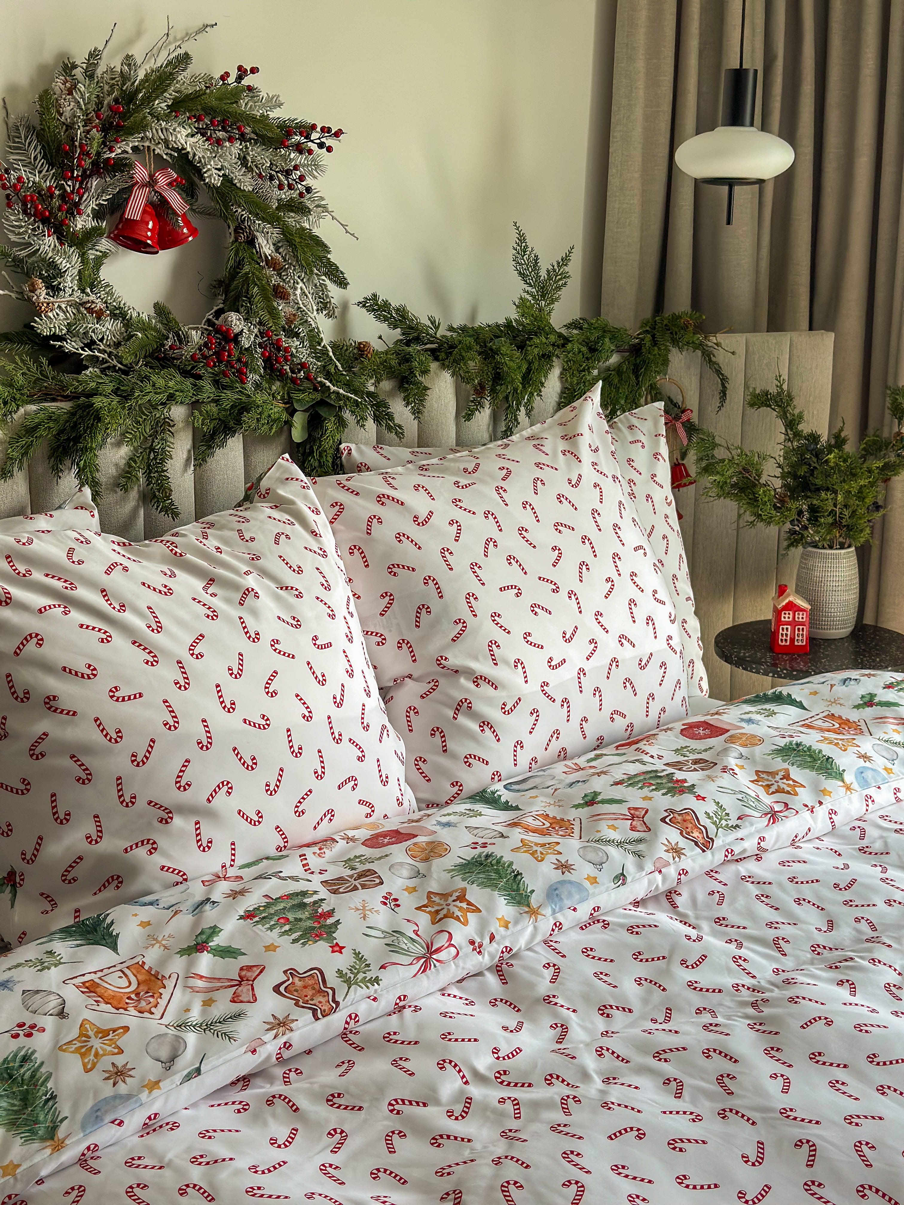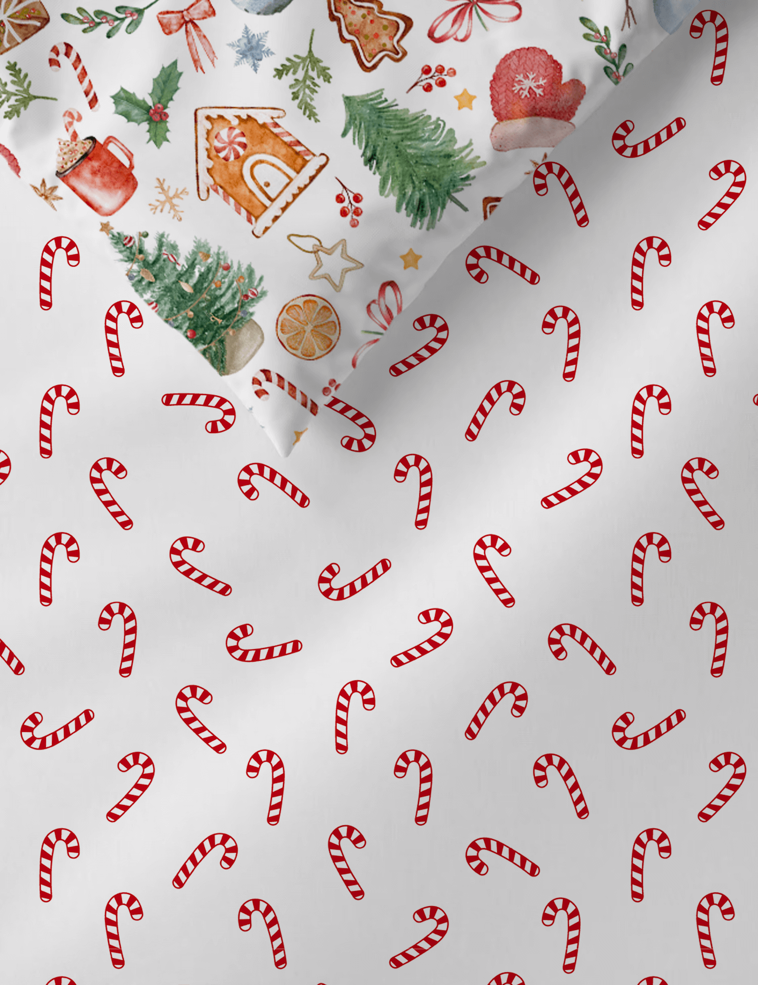 Z jednej strony wzór pełen uroczych choinek, pierniczków, bałwanków i mikołajowych dodatków, z drugiej – minimalistyczny, a zarazem zabawny motyw czerwono-białych lasek cukrowych.