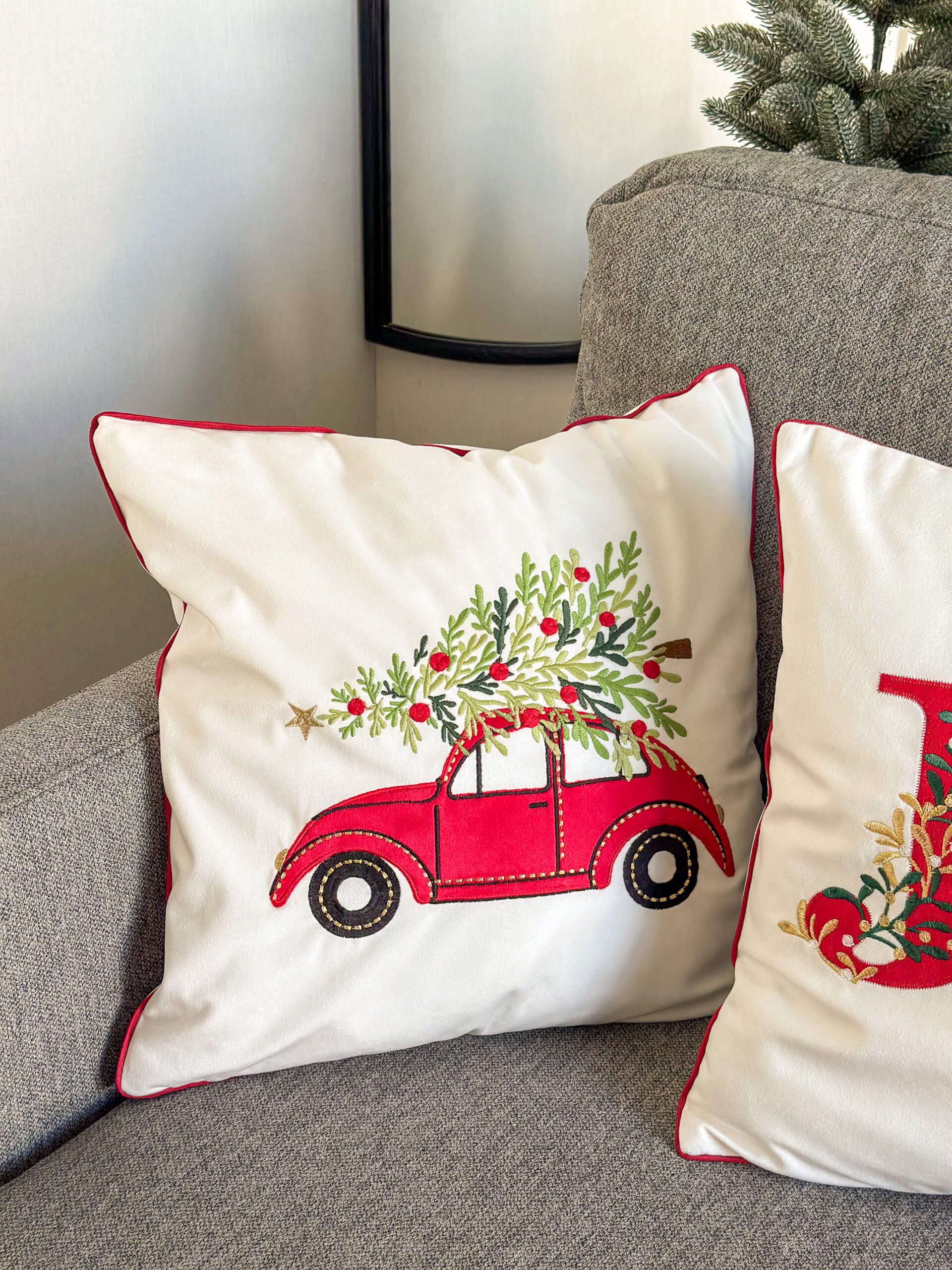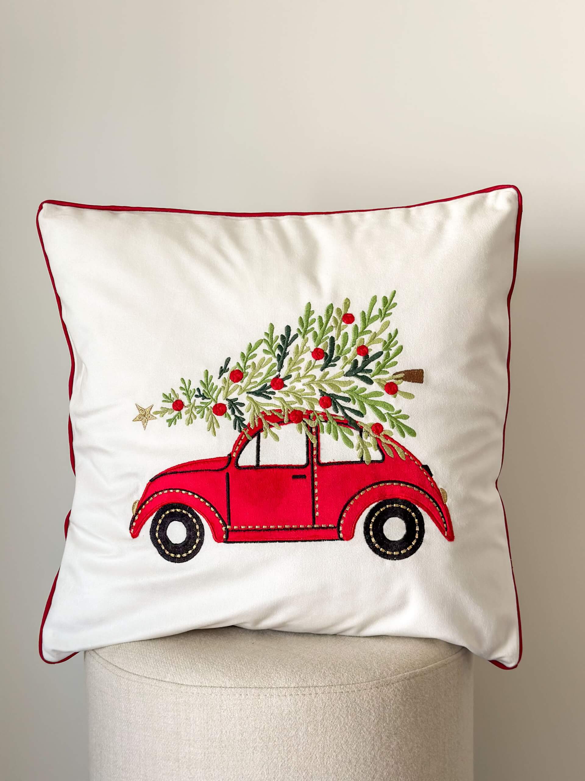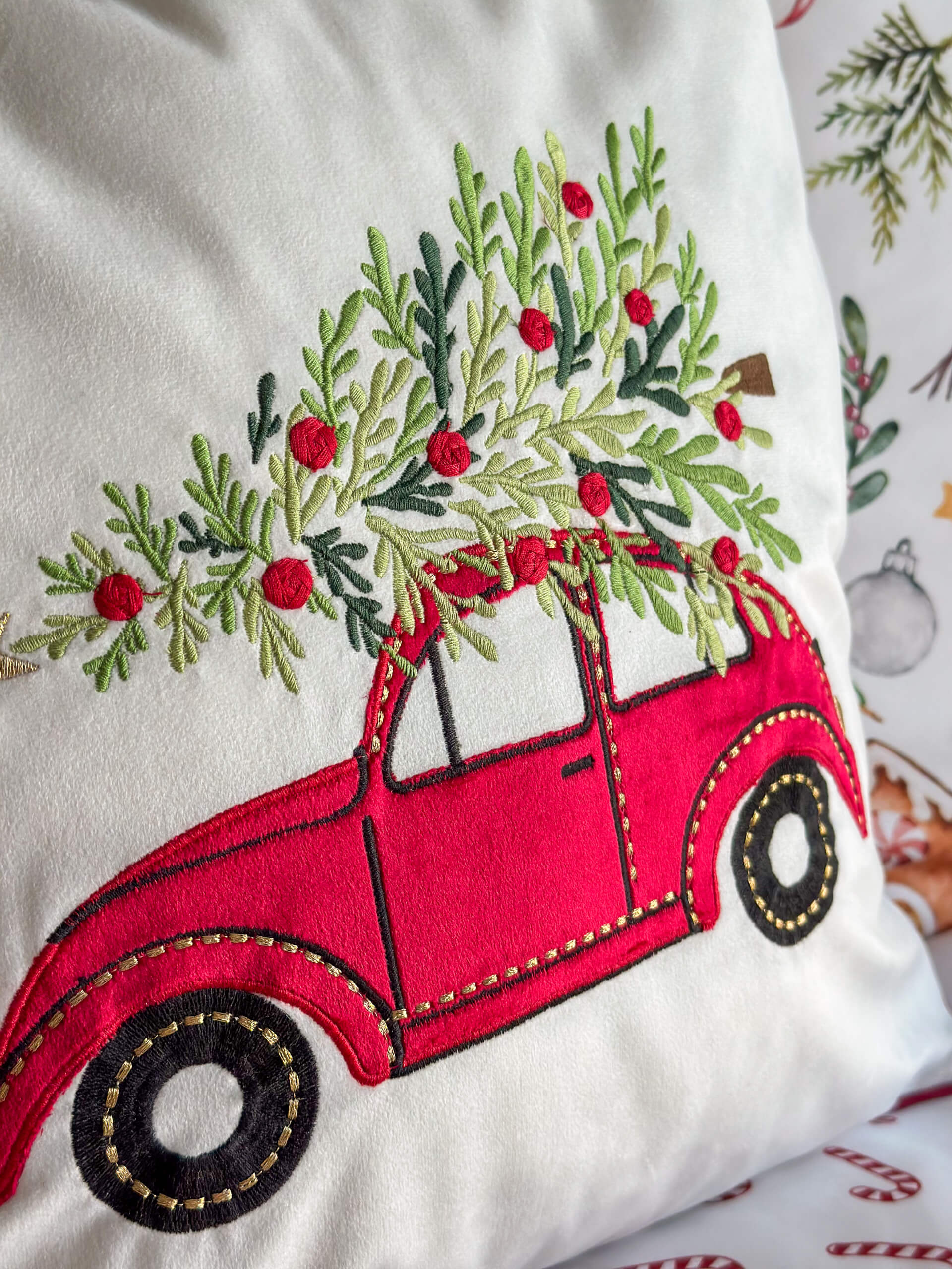 Haftowany czerwony samochód z choinką na dachu to klasyka bożonarodzeniowego stylu z nutą nostalgii.