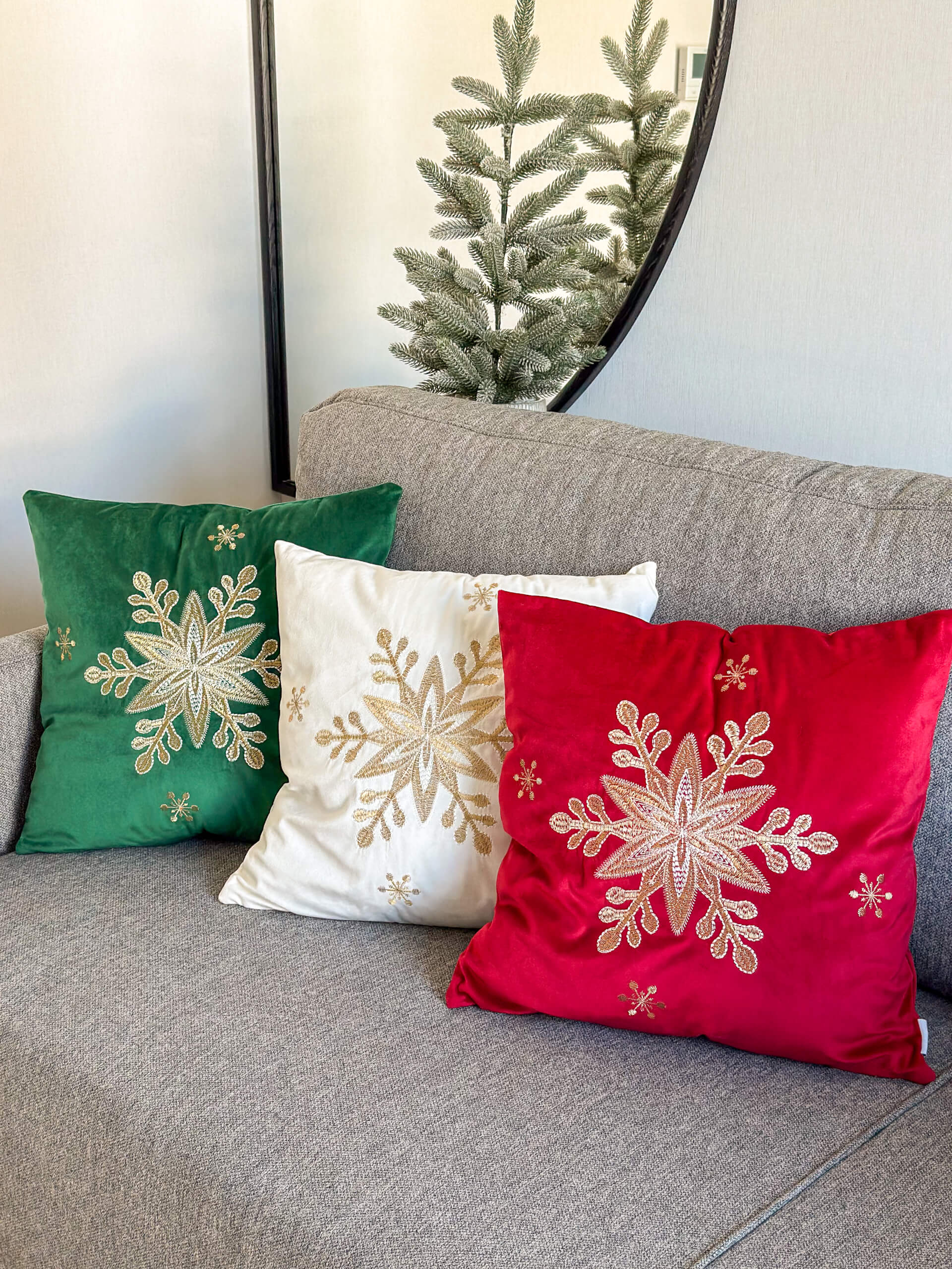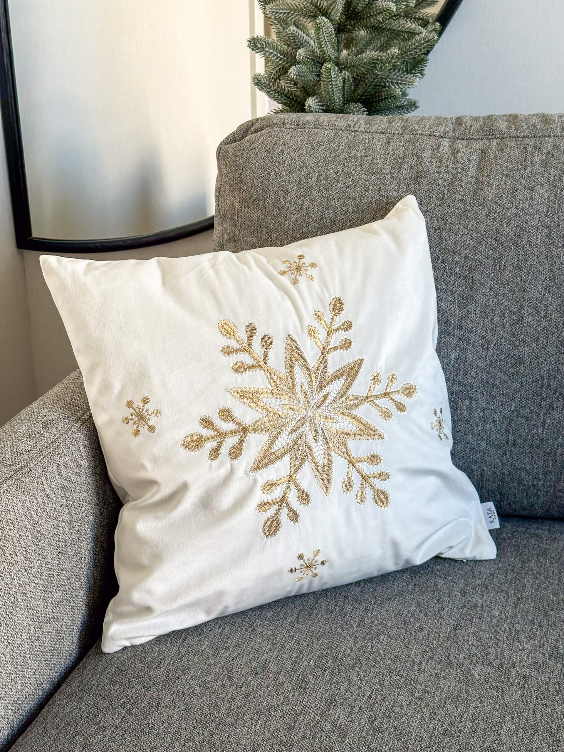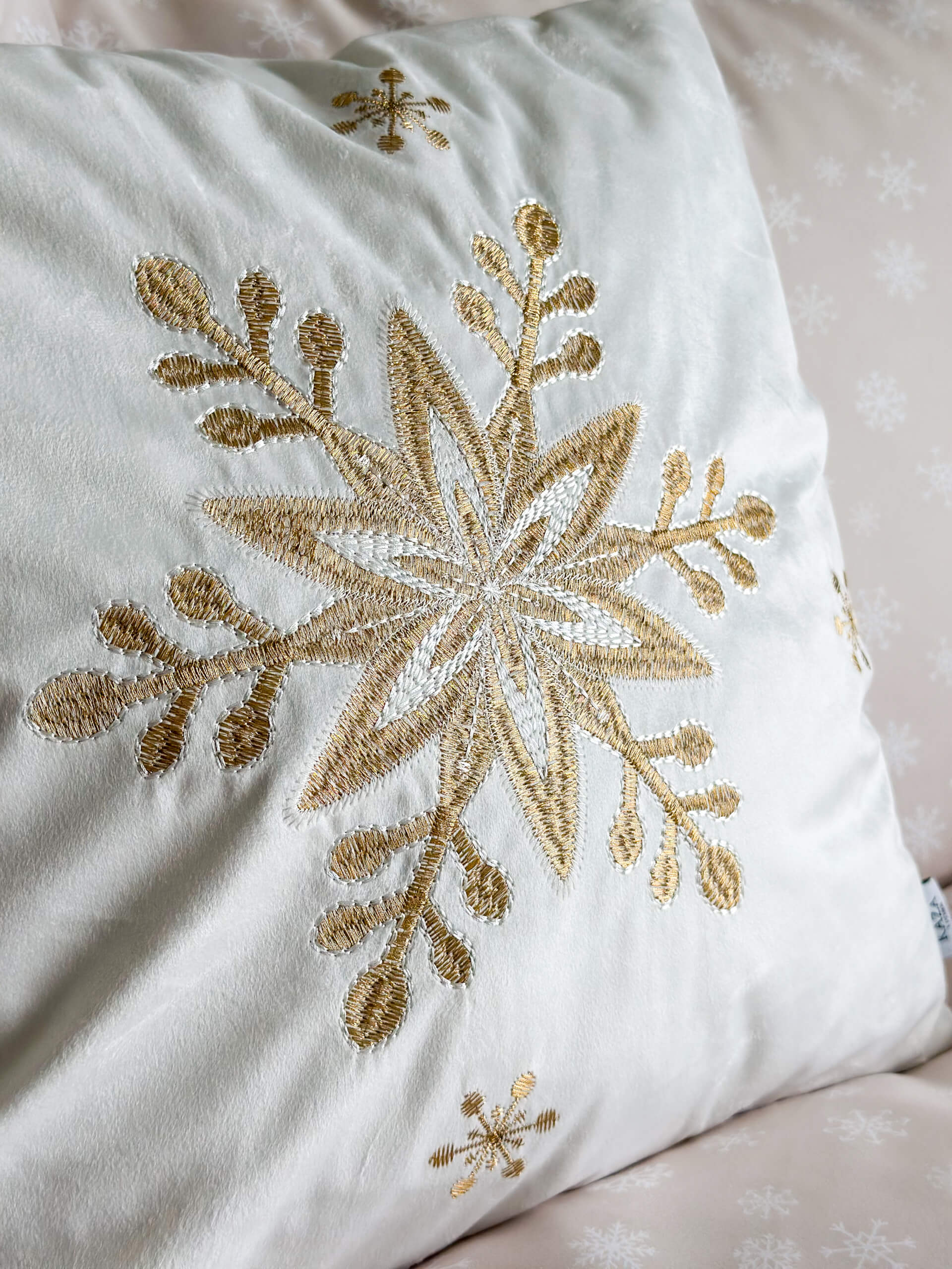Zachwyć się zimową klasyką! Poszewka NEVIA WHITE to idealne połączenie subtelnej bieli i złotego haftu w kształcie śnieżynki.
