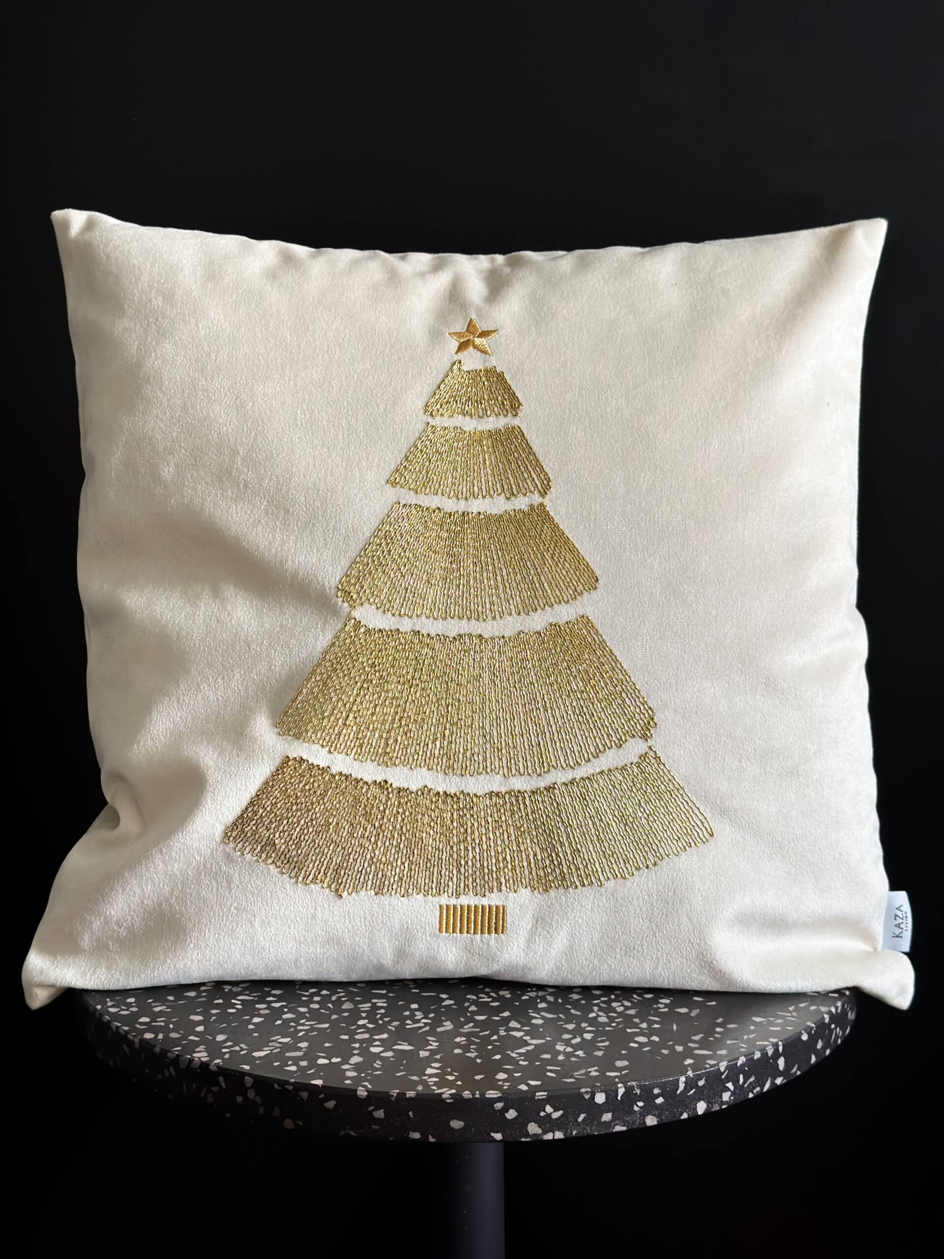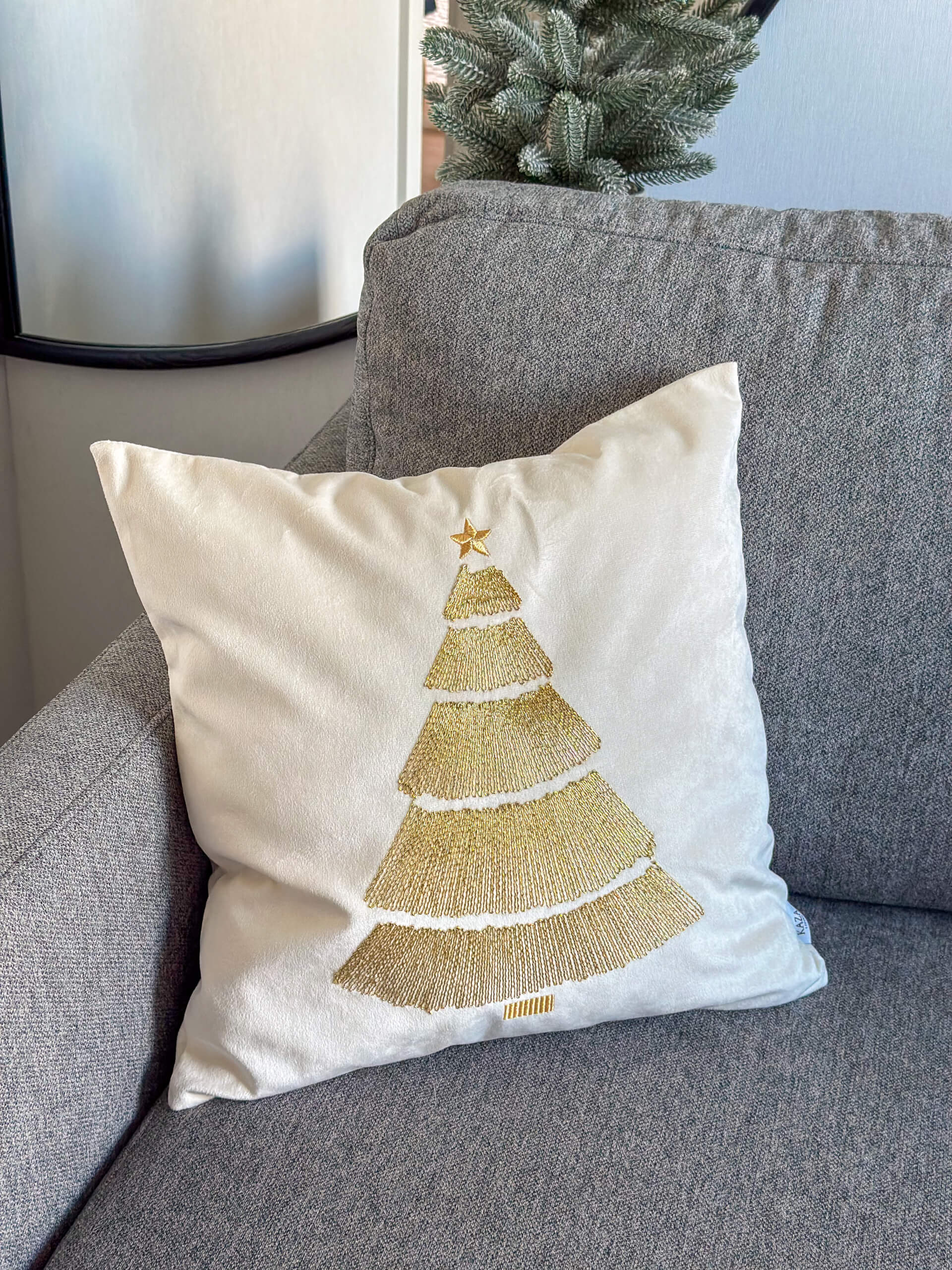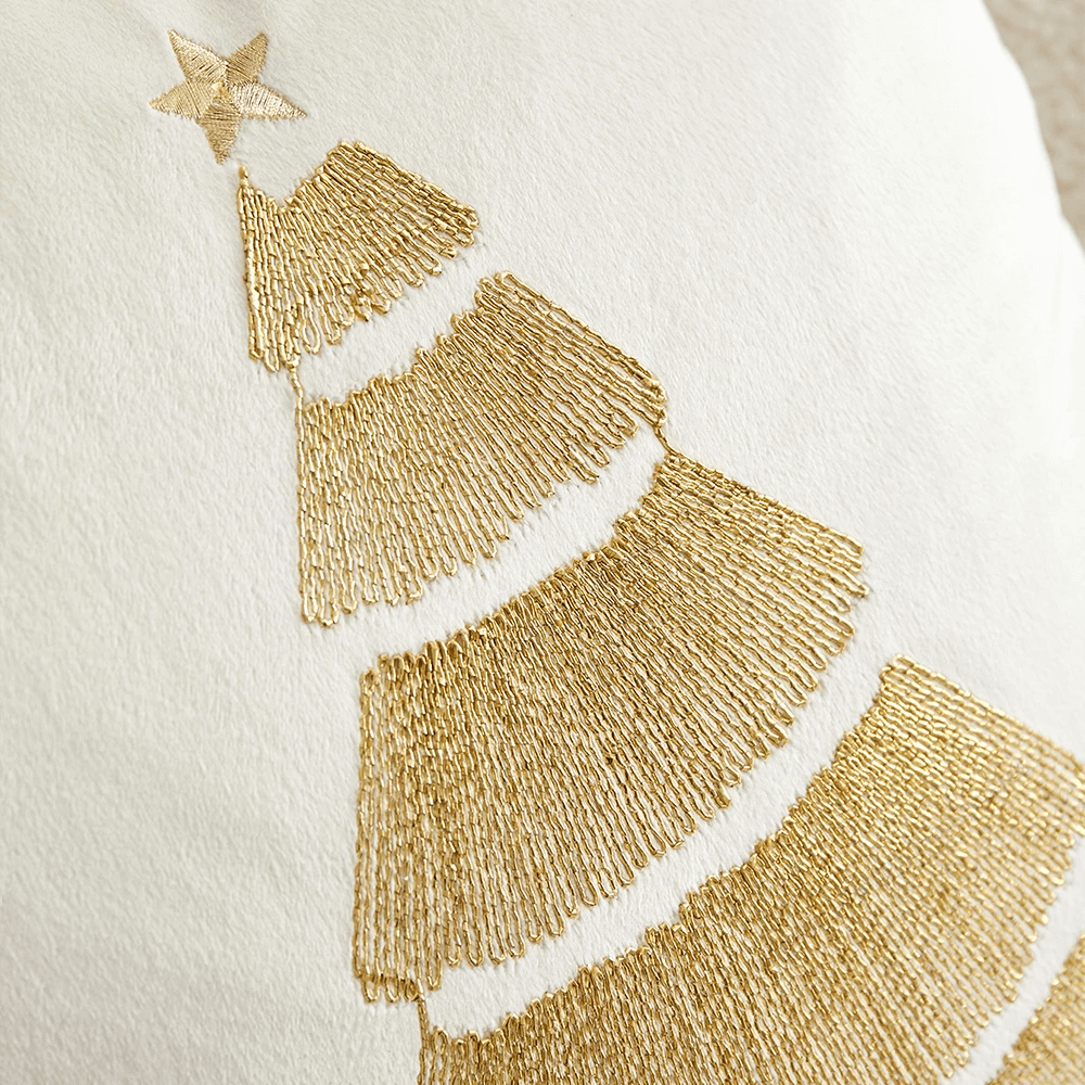 Biały, aksamitny materiał został ozdobiony delikatnym, złotym haftem przedstawiającym choinkę, dzięki czemu poduszka wpisuje się idealnie w świąteczny klimat, nie tracąc przy tym klasy i minimalizmu.