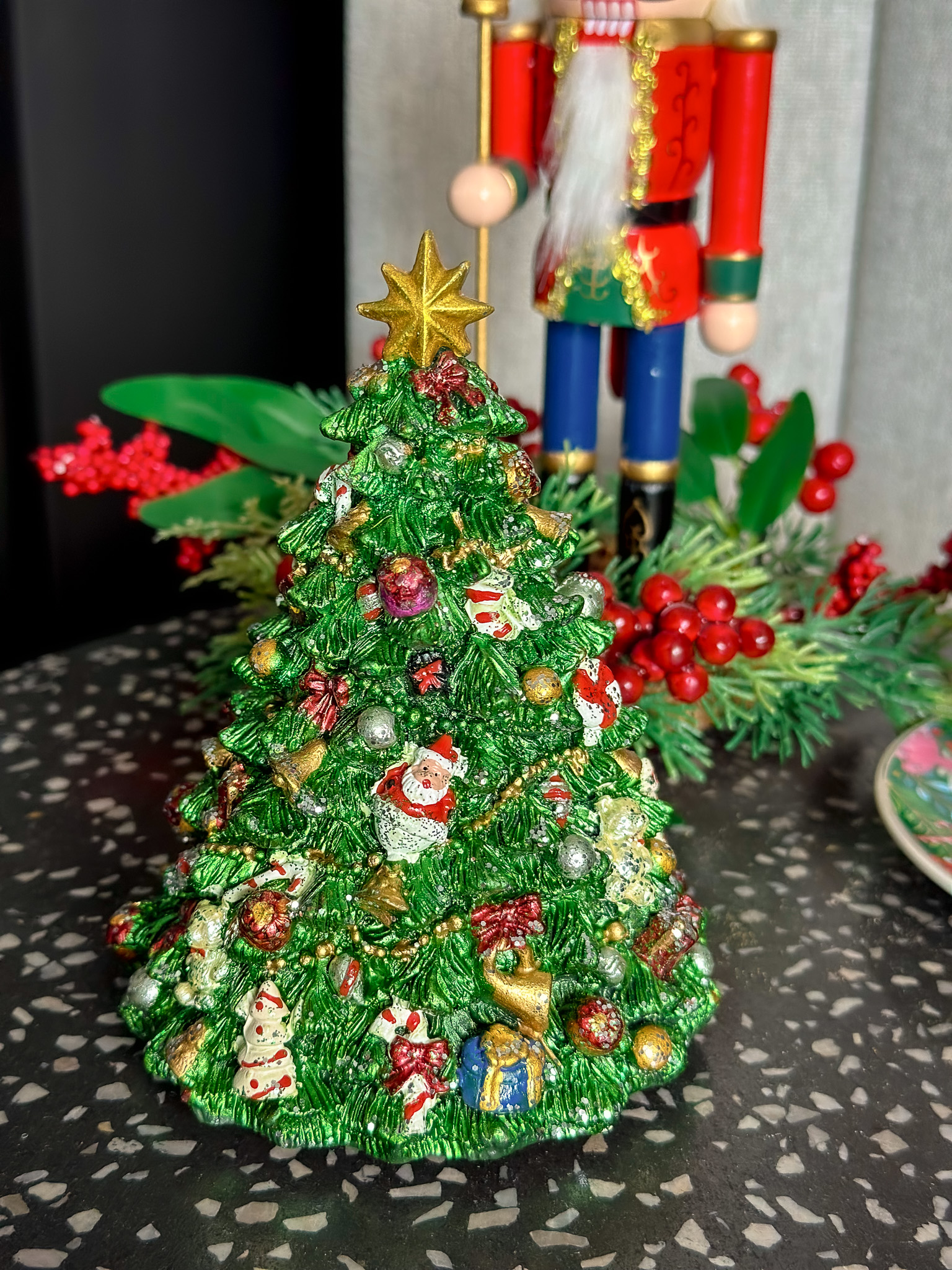 Figurka bogata w detale: Mikołajki, prezenty, cukierki i złote bombki sprawiają, że ta dekoracja przyciąga wzrok i cieszy serce. Idealna na prezent, do postawienia na kominku, komodzie lub w dziecięcym pokoju.