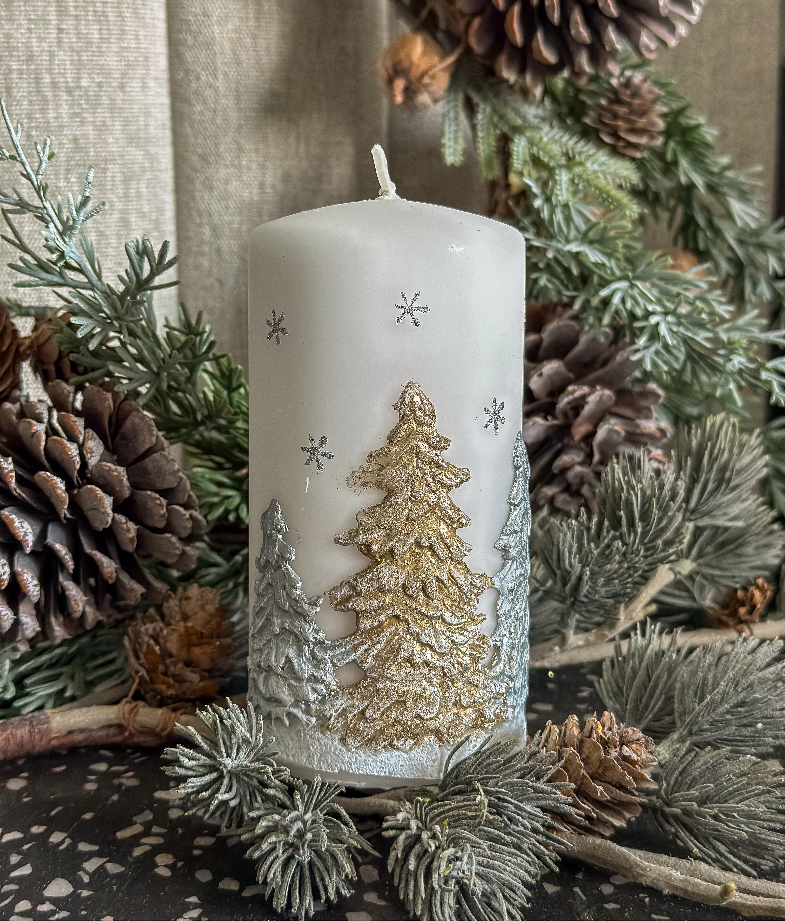 GLIMORIA to elegancka świeca ozdobna z trójwymiarowym motywem świerków pokrytych brokatem w kolorach złota i srebra. Idealna do świątecznych aranżacji, stroików czy prezentowych zestawów. Wykonana z wysokiej jakości parafiny, pali się stabilnym płomieniem, wprowadzając ciepło i magiczny klimat do każdego wnętrza.