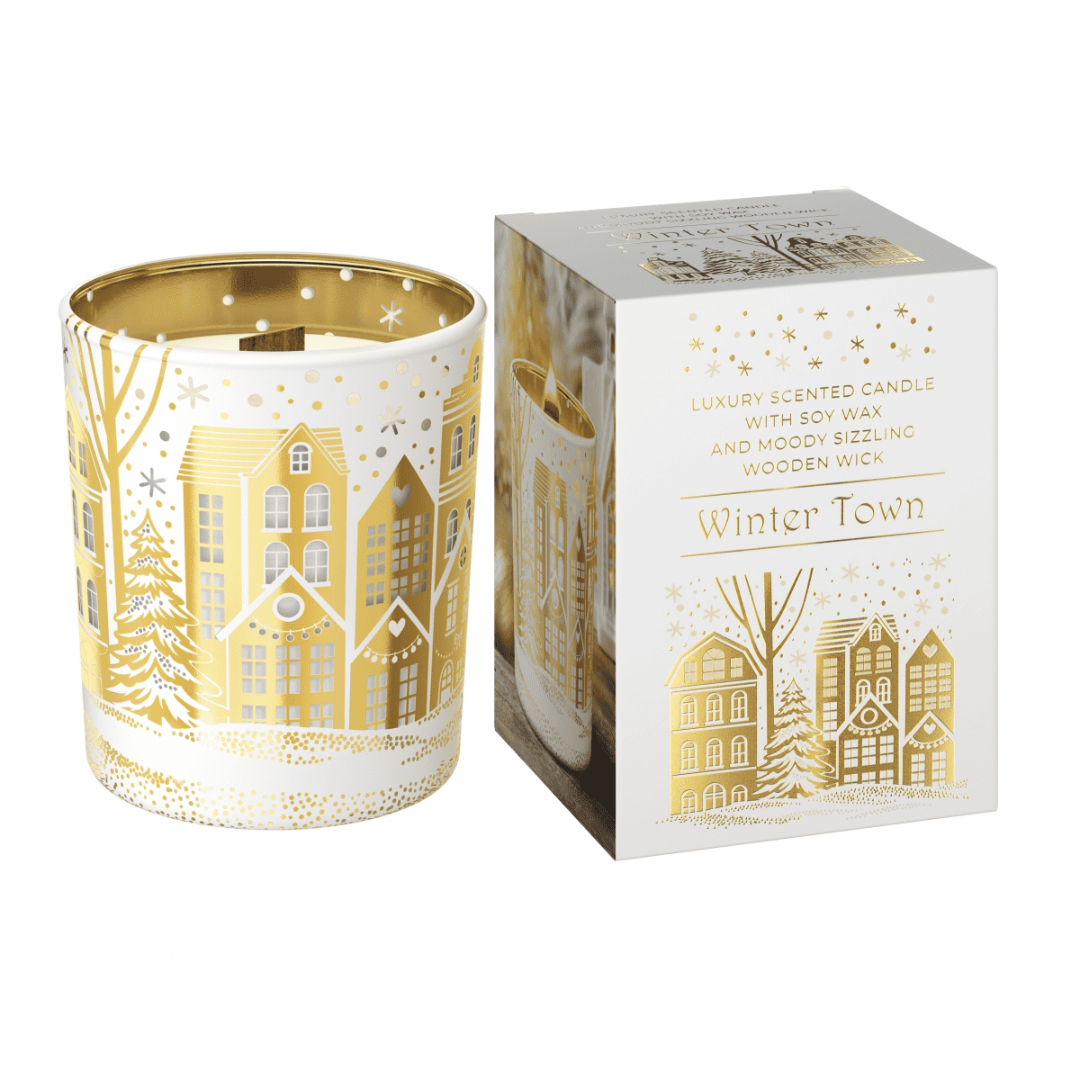 WINTER TOWN to wyjątkowa świeca zapachowa, która zachwyca nie tylko eleganckim, złoto-białym designem, ale także bogatą kompozycją zapachową. Drewniany knot skwierczy jak prawdziwy kominek, tworząc przytulną atmosferę w długie zimowe wieczory. Świeca zawiera naturalny wosk sojowy.